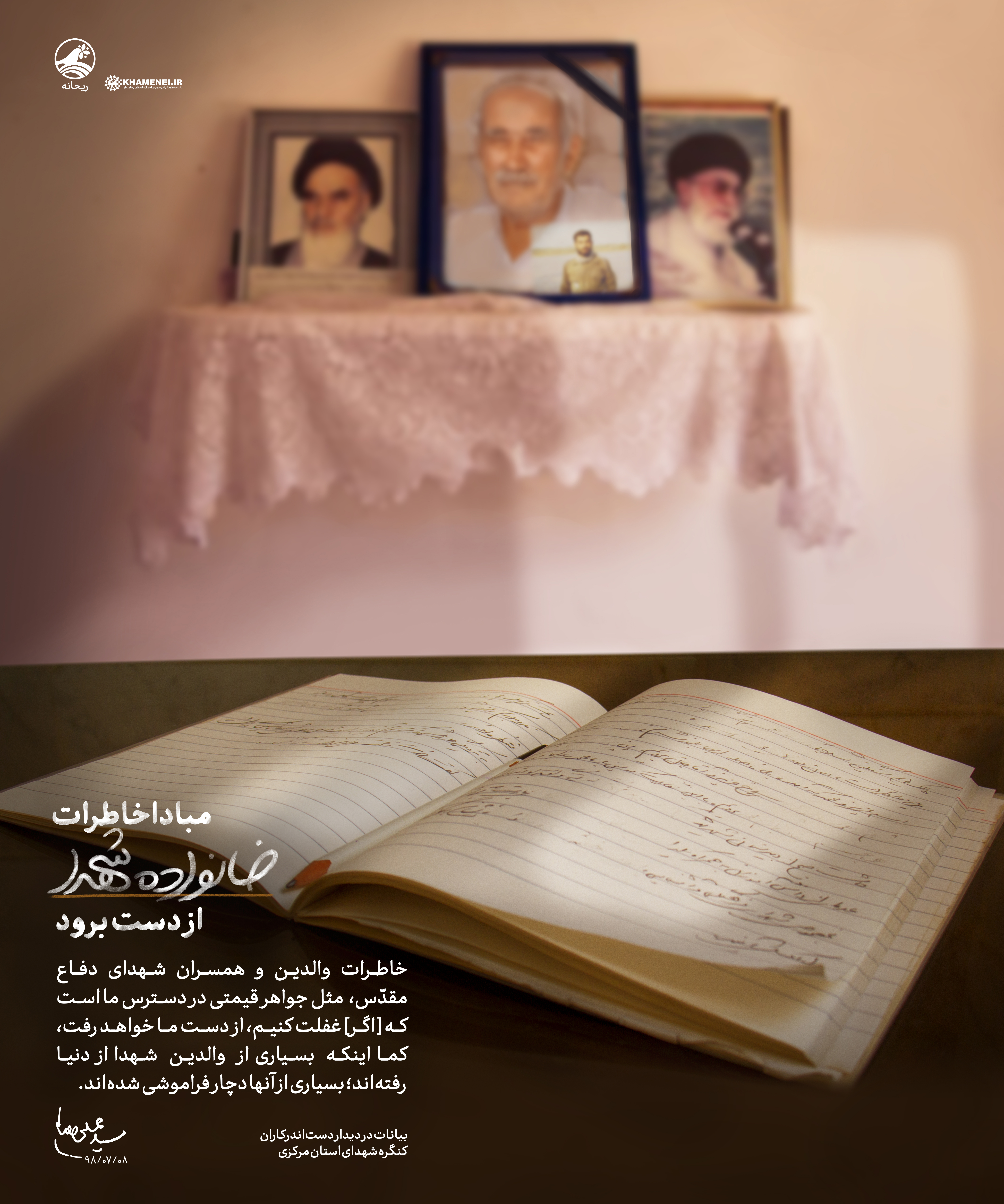 حضرت آیتالله خامنهای: «خاطرات والدین و همسران شهدای دفاع مقدّس، مثل جواهر قیمتی در دسترس ما است که [اگر] غفلت کنیم، از دست ما خواهد رفت، کما اینکه بسیاری از والدین شهدا از دنیا رفتهاند؛ بسیاری از آنها دچار فراموشی شدهاند.» ۱۳۹۸/۰۷/۰۸